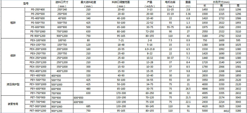 其中PET是碳素行业的阳和阴用颚式破碎机,以代替传统液压机,具有投资少、益高等点;PEY具有液压保护作用,有解决了钢渣等冶金渣破碎中的“卡钢”问题。